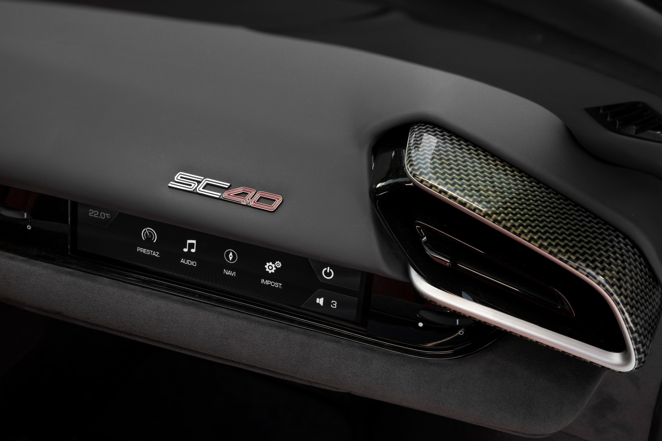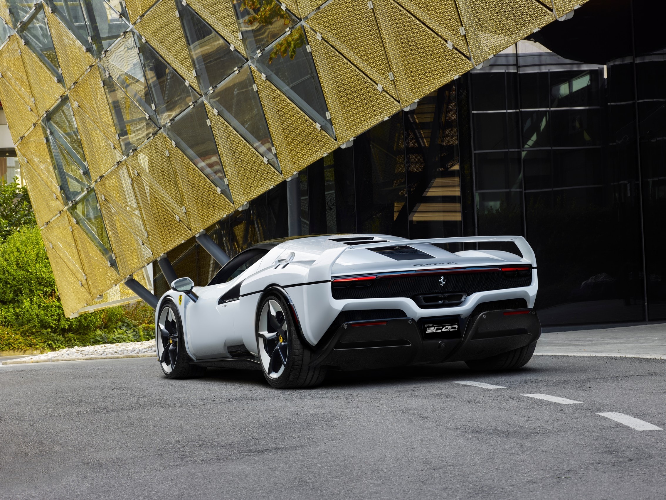 외관 색상은 SC40 전용 화이트 컬러를 기본으로, 곳곳에 블랙 포인트를 더해 대비를 살렸다. 실내는 카본-케블라 소재를 적극 활용해 가볍고 단단한 분위기를 강조했다. 시트는 차콜 알칸타라와 붉은 자카드 패브릭을 조합해 완성됐으며, 머리받침에는 페라리의 상징인 말 엠블럼과 ‘SC40’ 로고가 자수로 새겨졌다.